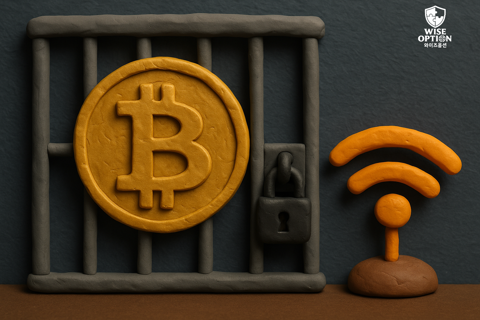 가상화폐 ETF 제도화의 이중성을 시각적으로 표현한 클레이메이션 스타일 아트워크. 감옥에 갇힌 비트코인은 투자자 자유의 상실을, 그 옆에 놓인 Wi-Fi 심볼은 제한된 편의성과 연결성을 상징한다.