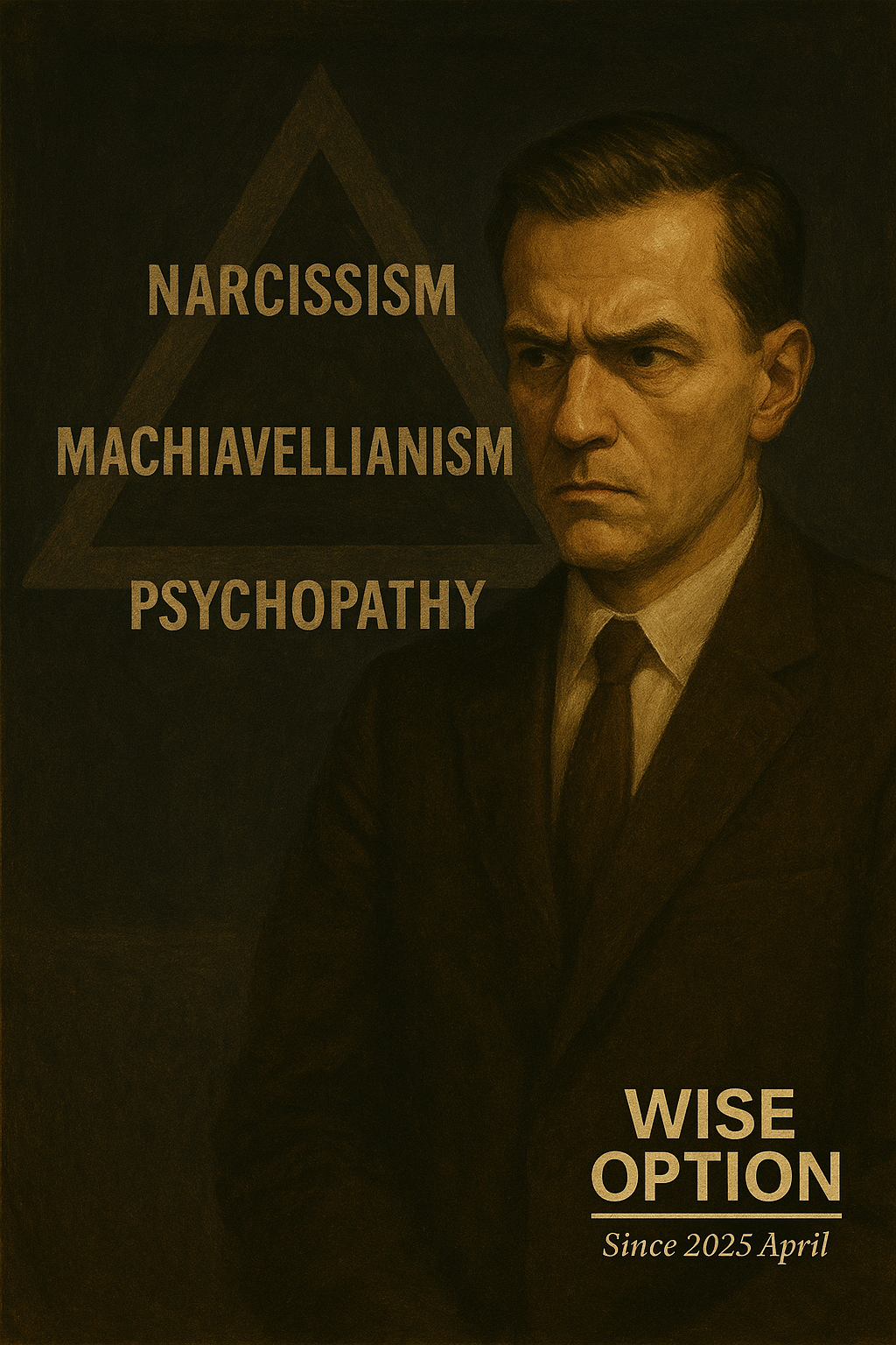 다크 트라이어드(Dark Triad)를 상징하는 유화 초상화로, 나르시시즘, 마키아벨리즘, 사이코패시의 심리를 상징하는 삼각형과 함께 WISE OPTION 로고가 삽입된 이미지입니다. 어둠의 심리학 수업을 상징적으로 표현하며, 조종과 권력, 인간관계의 어두운 본질을 시각적으로 전달합니다.
