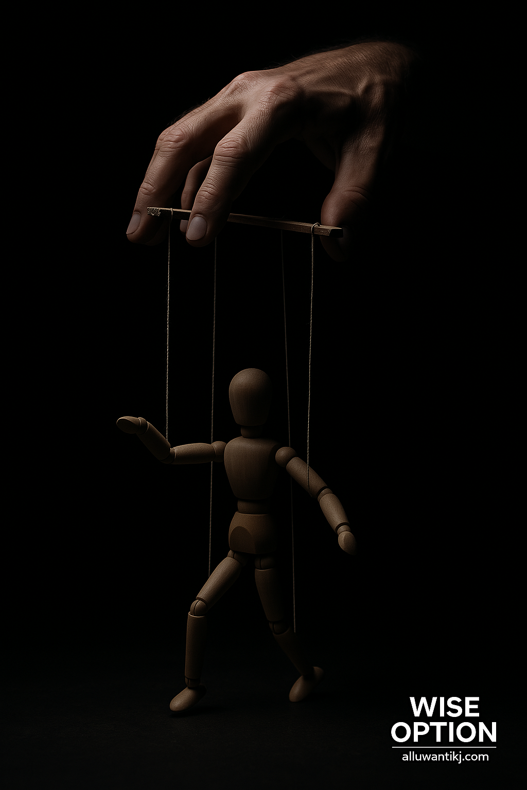 어두운 배경 위, 한 손이 나무 꼭두각시 인형을 조종하고 있는 모습. 조종하는 손과 인형 사이의 실이 뚜렷하게 보이며, 'WISE OPTION' 로고가 오른쪽 아래에 위치함. 심리 조작과 무의식 조종의 메타포로 활용 가능한 이미지.