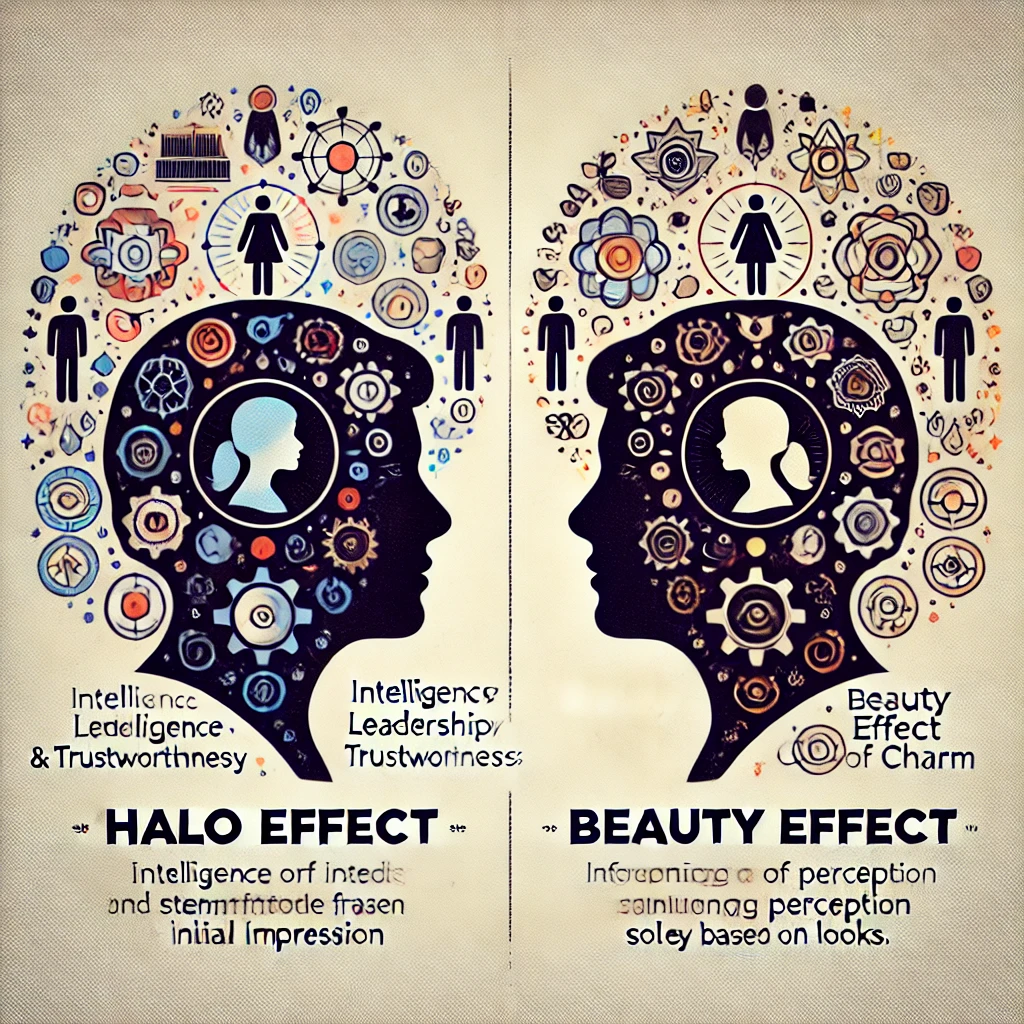 후광효과(Halo Effect)와 뷰티 이펙트(Beauty Effect)는 둘 다 첫인상과 외적인 요소가 사람의 평가에 영향을 미친다는 점에서 유사하지만, 중요한 차이점이 있습니다.